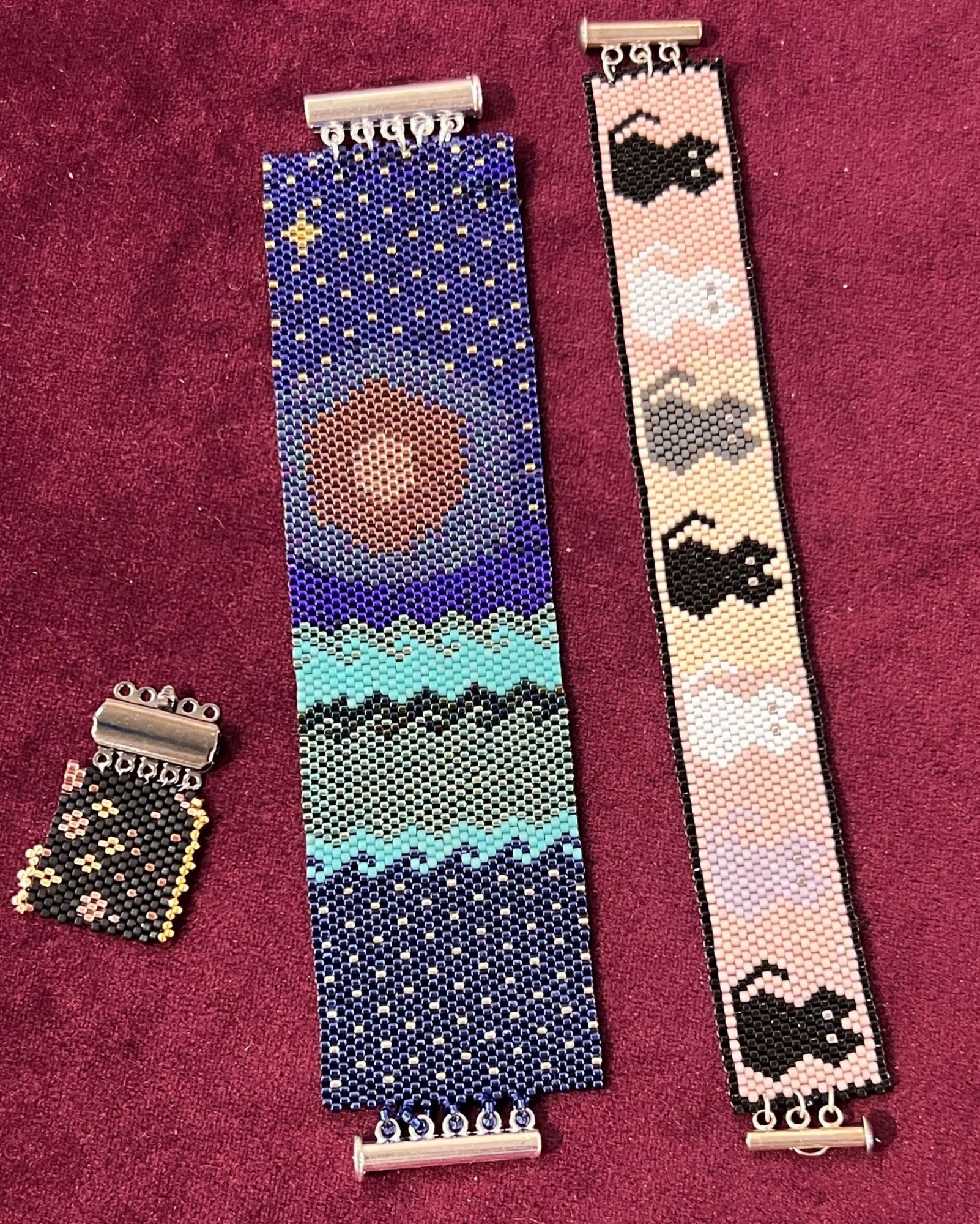 Peyote stitch is an essential bead weaving stitch, used in many projects from beginner to advanced levels. In Beggining Peyote Class you will easily learn Even-count peyote by making a striped strip with 4 colors of Delica Beads. About an hour later we switch to the adorable Kitty Cat bracelet learning how to read a peyote stitch graph pattern as well as a word chart. You can use the same 4 colors for the kitties or choose to make them as colorful as you like.